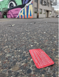 A tattered red card highlighting immigrant rights lies on the street amidst the littered remains of a violent conflict between federal agencies and civil resistance.